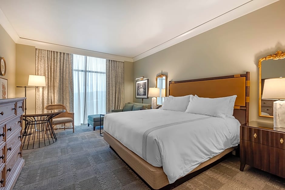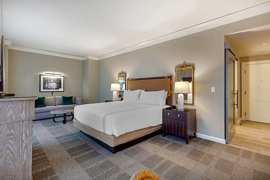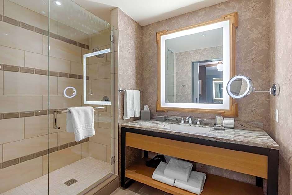 Champions Ada Exec Ste Roll In Shwr 1 King Bed is 517 square feet and includes a king-size bed 150-183 width plus balcony, extra beds on demand, and slippers and is Wheelchair-accessible.